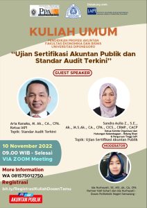 Pada hari Kamis tanggal 10 November 2022, PPAk FEB Universitas Diponegoro bekerjasama dengan Institut Akuntan Publik Indonesia (IAPI) menyelenggarakan kuliah umum dengan tema Ujian Sertifikasi