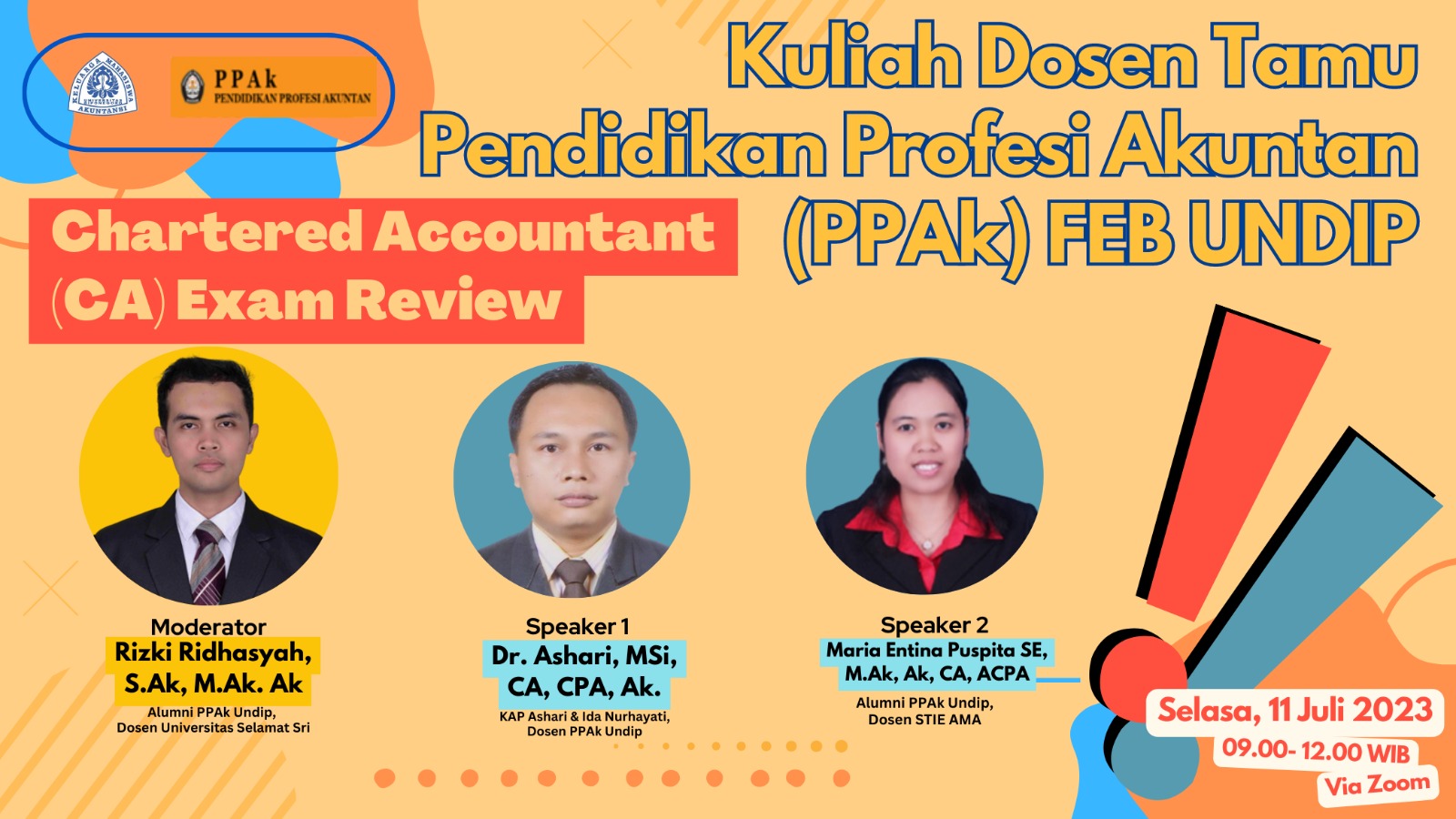 Program Pendidikan Profesi Akuntan Fakultas Ekonomika dan Bisnis Universitas Diponegoro menyelenggarakan Kuliah Dosen Tamu dengan tema “Chartered Accountant (CA) Exam Review” pada hari Selasa, tanggal 11 Juli 2023 pukul 09.00 – 12.00 WIB , melalui media Zoom Meeting , Narasumber Dr. Ashari, MSi, CA, CPA, Ak. (KAP Ashari & Ida Nurhayati, Dosen PPAk Undip) dan Maria Entina Puspita SE, M.Ak, Ak, CA, ACPA (Alumni PPAk Undip, Dosen STIE AMA) , Moderator Rizki Ridhasyah, S.Ak, M.Ak. Ak. (Alumni PPAk Undip, Dosen Universitas Selamat Sri)